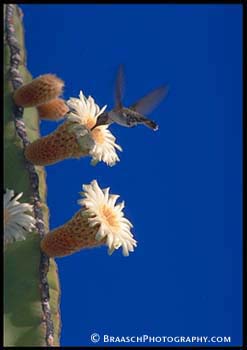 Pollination. Cactus. Cardon. Flowers. Hummingbird. Birds. Desert. Sonoran desert. Mexico. |